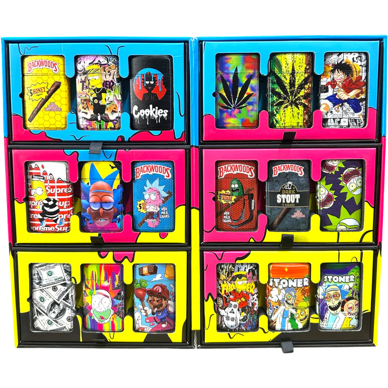 Torch Lighter Fold Out Display Box. 18 different torch lighter designs (4 units of each design) in a fold out, counter friendly box. Great for convenience stores, liquor stores, gas stations, smoke shops, and novelty stores!